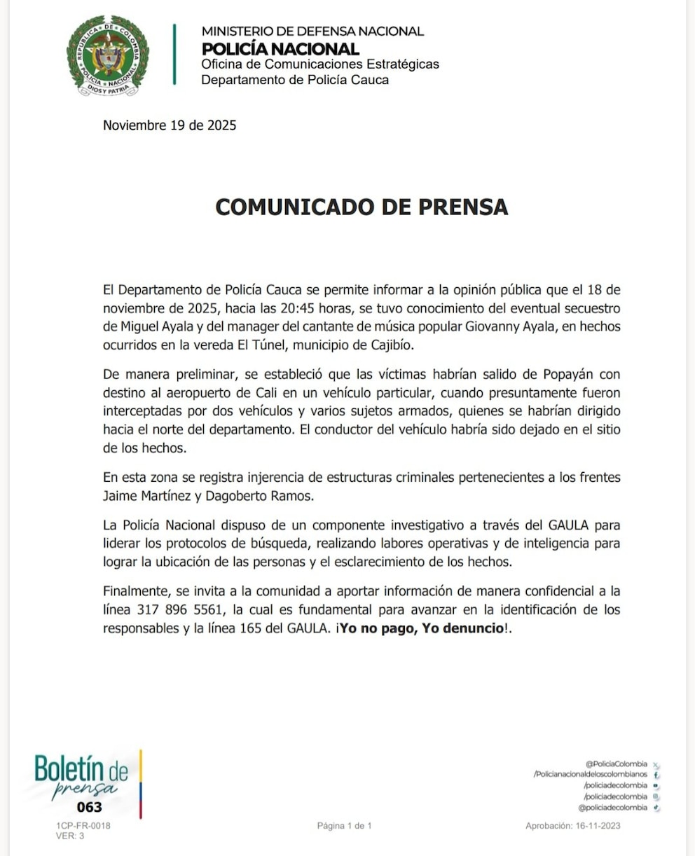 “De manera preliminar, se estableció que las víctimas habrían salido de Popayán con destino al aeropuerto de Cali en un vehículo particular, cuando presuntamente fueron interceptadas por dos vehículos y varios sujetos armados, quienes se habrían dirigido hacia el norte del departamento. El conductor del vehículo habría sido dejado en el sitio de los hechos”, expresó la Policía Nacional en un comunicado.
