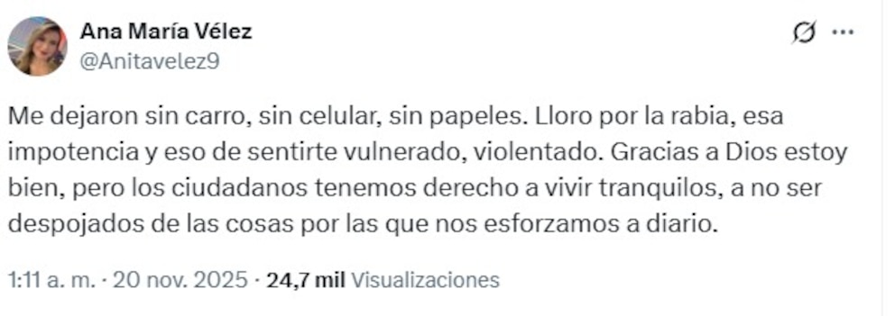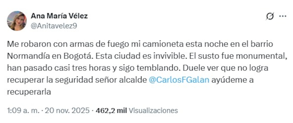 “Me robaron con armas de fuego mi camioneta esta noche en el barrio Normandía en Bogotá. Esta ciudad es invivible. El susto fue monumental, han pasado casi tres horas y sigo temblando. Duele ver que no logra recuperar la seguridad, señor alcalde Carlos Fernando Galán, ayúdeme a recuperarla (el carro)”, escribió Vélez en su perfil de X.